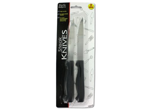 Stainless steel steak knives have ergonomic plastic handles for comfort This 2 piece set is ideal for any kitchen Each blade is serrated for maximum strength Knives are packaged in a blister card with hanging hole Each knife measures approximately 8 12 with a 4 14 blade