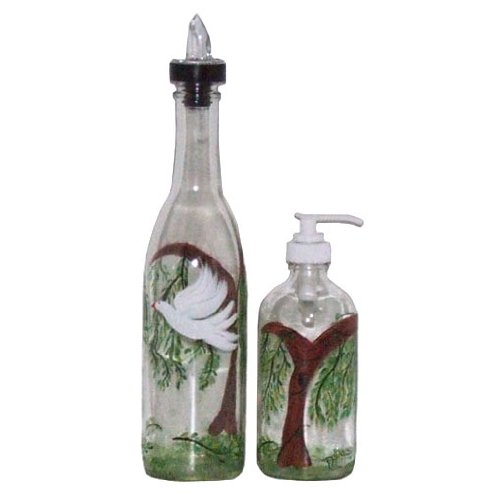 White dove with olive branch is featured on this bottle set Brighten up your kitchen or bathroom by putting these lovely containers on top of the counter not under it Can be used for condiments andor liquid soap or use in the bedroombath for soap or lotion Hand painted made to order and sign